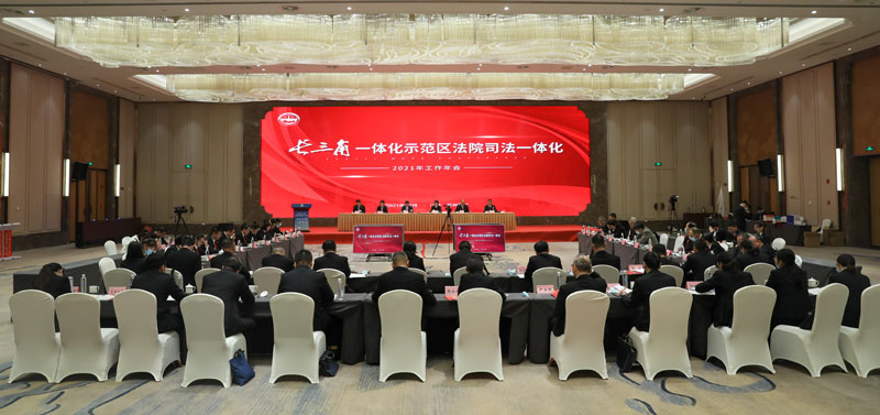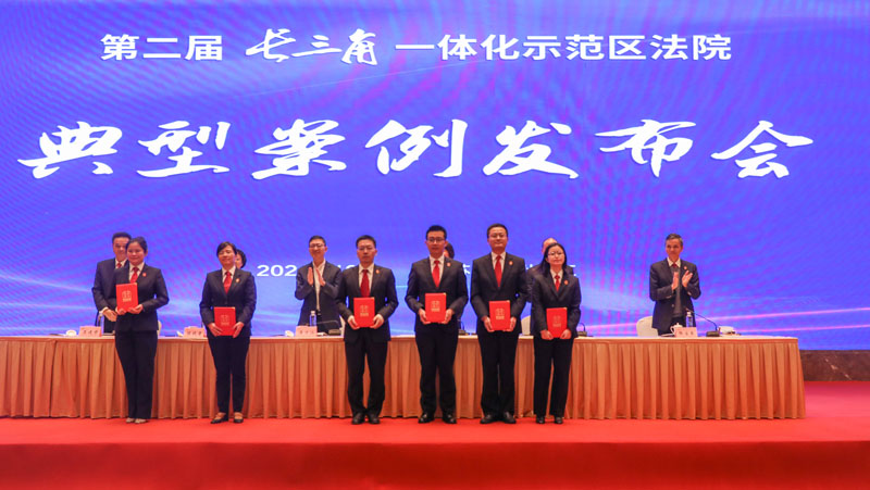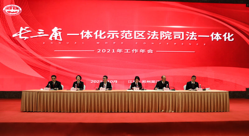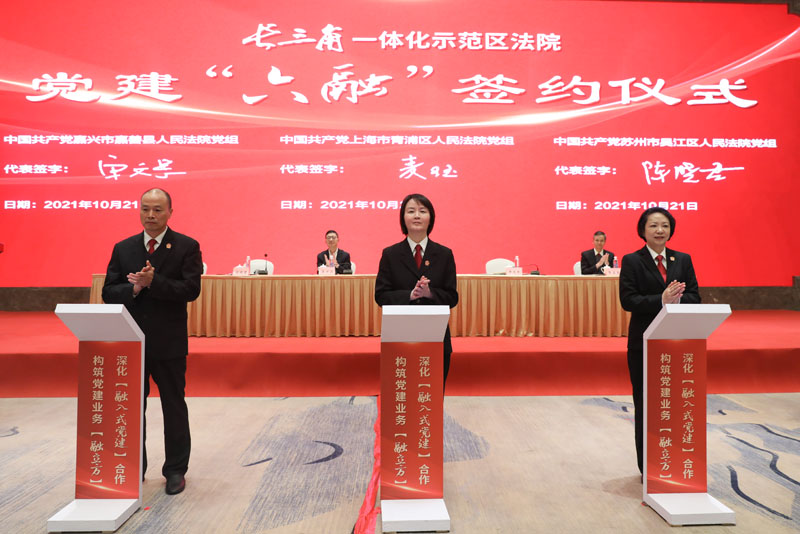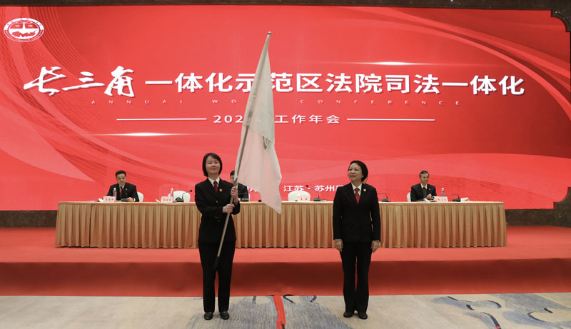 10月21日下午,上海青浦区法院、江苏吴江区法院、浙江嘉善县法院在江苏吴江举行长三角一体化示范区法院司法一体化2021年工作年会。苏州中院,青浦、吴江、嘉善三地法院领导、部门负责人和媒体代表等参加会议。 年会现场播放了示范区法院党建“六融”协议介绍VCR,以动画形式展示了三地法院构建多元化跨省际的党建与业务交流共融机制,实现党建工作从“相加”到“互融”的新格局。 会上,上海青浦、江苏吴江、浙江嘉善三地法院领导共同签署了《示范区法院党建“六融”协议》,协议对前期“融入式”联合党建工作总结提升,更鲜明地树立了以党建为旗帜和引领,涵盖了党建品牌建设、学习阵地打造、法律人才共育、专业能力共提等方面。 青吴嘉三地法院政治部主任启动示范区法院青年干警融入式体验营项目。 为全面贯彻沪苏浙三地高院工作要求,落实三地法院《服务保障长三角生态绿色一体化建设司法协作协议》,总结示范区法院审判工作经验,发挥优秀案例的示范指引作用,促进司法裁判尺度统一,会前,三地法院联合开展了第二届长三角一体化示范区法院“十大民事典型案例”“十大优化法治化营商环境典型案例”“十大执行典型案例”评选活动。青浦区法院党组成员、副院长张富泉宣读了第二届长三角一体化示范区法院十大典型案例评选结果。三地法院领导为获选案例作者代表颁奖。 青浦区法院民事审判庭庭长蔡红兰解读了“十大民事典型案例”,三地法院各业务条线将持续开展研讨交流,共同助力长三角一体化示范区司法协作发展。 会上,吴江、嘉善、青浦三地法院领导分别作了交流发言。 青浦区法院党组书记、院长麦珏指出,通过打造诉讼服务快车道、完善法庭协作新格局、优化适法统一新标尺、共筑长三角信用示范区等,三地法院在司法服务保障示范区发展建设上取得积极务实成效。青浦区法院将以示范指引导向推进适法统一,更好地规范类案裁判尺度,带动示范区审判水平整体提升;以司法为民理念优化诉讼服务,主动对接示范区建设司法需求,坚持把非诉讼纠纷解决机制挺在前面;以共建共享目标强化科技应用,重点探索审判执行信息数据一体化在跨域诉讼服务、案件庭审、电子送达等方面发挥更大效能;以党建引领要求狠抓队伍建设,坚持抓党建、带队建、促审判的工作理念,走党建与审判工作有机融合之路,增强主动性、协同性、前瞻性,以更加精准的举措、更加务实的办法,推动司法协作出成果、见实效。 随后,吴江区法院陈晓君院长将印有“创新、协同、示范”字样的会旗交接至下一届承办法院青浦区法院麦珏院长手中,三地法院司法一体化迎来又一崭新的起点。 苏州中院党组副书记、副院长吴万江强调,三地法院要做政治忠诚的坚定拥护者,擦亮党建品牌,做司法业务的勇敢先行者,持续改革创新,做服务发展的优秀示范者,主动担当作为,在长三角一体化建设中,不断探索、努力创新,在“高质量一体化”中不断贡献司法力量。