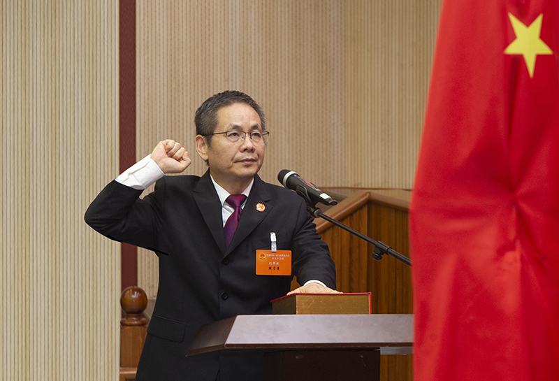 月21日,上海市黄浦区第二届人民代表大会第九次会议采取无记名投票方式,补选段守亮同志为上海市黄浦区人民法院院长。大会举行宪法宣誓仪式,段守亮院长面向国旗,庄严宣誓。(区新闻中心供图)